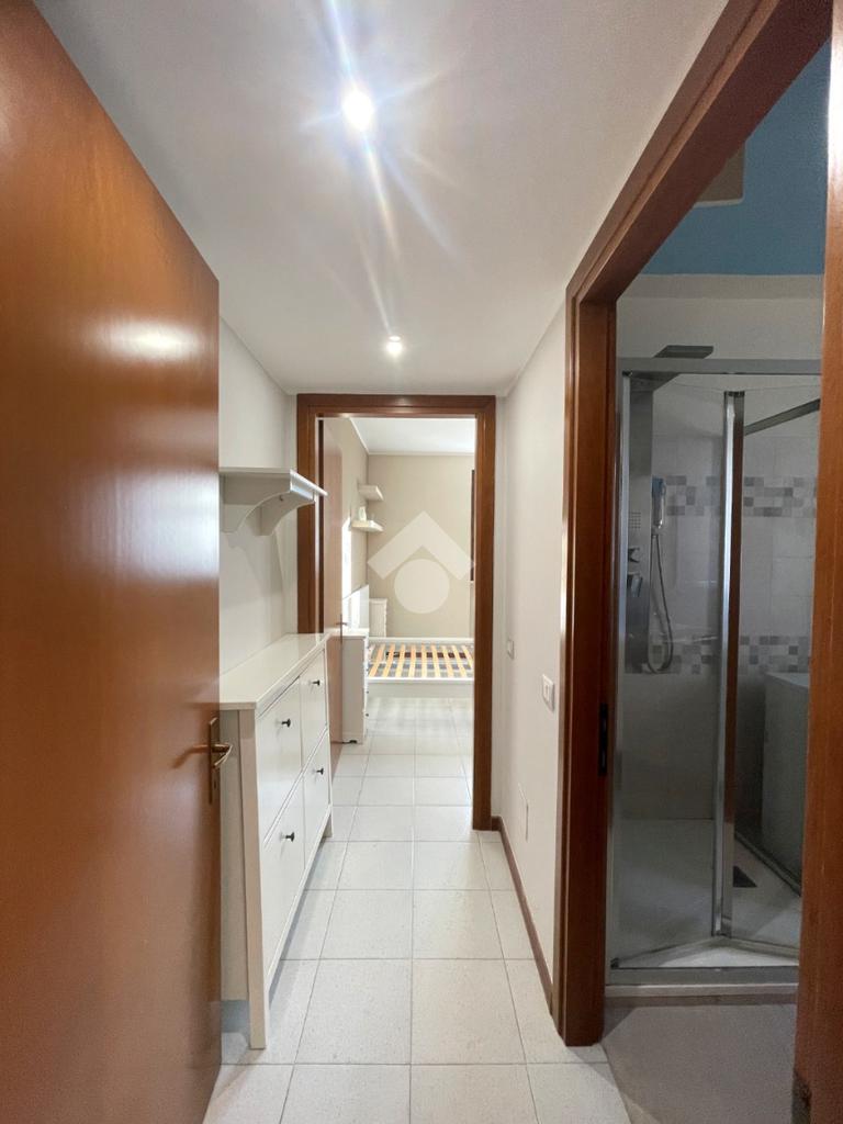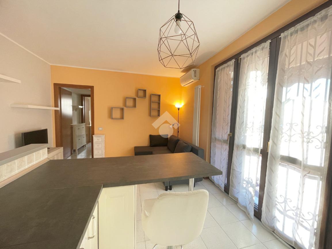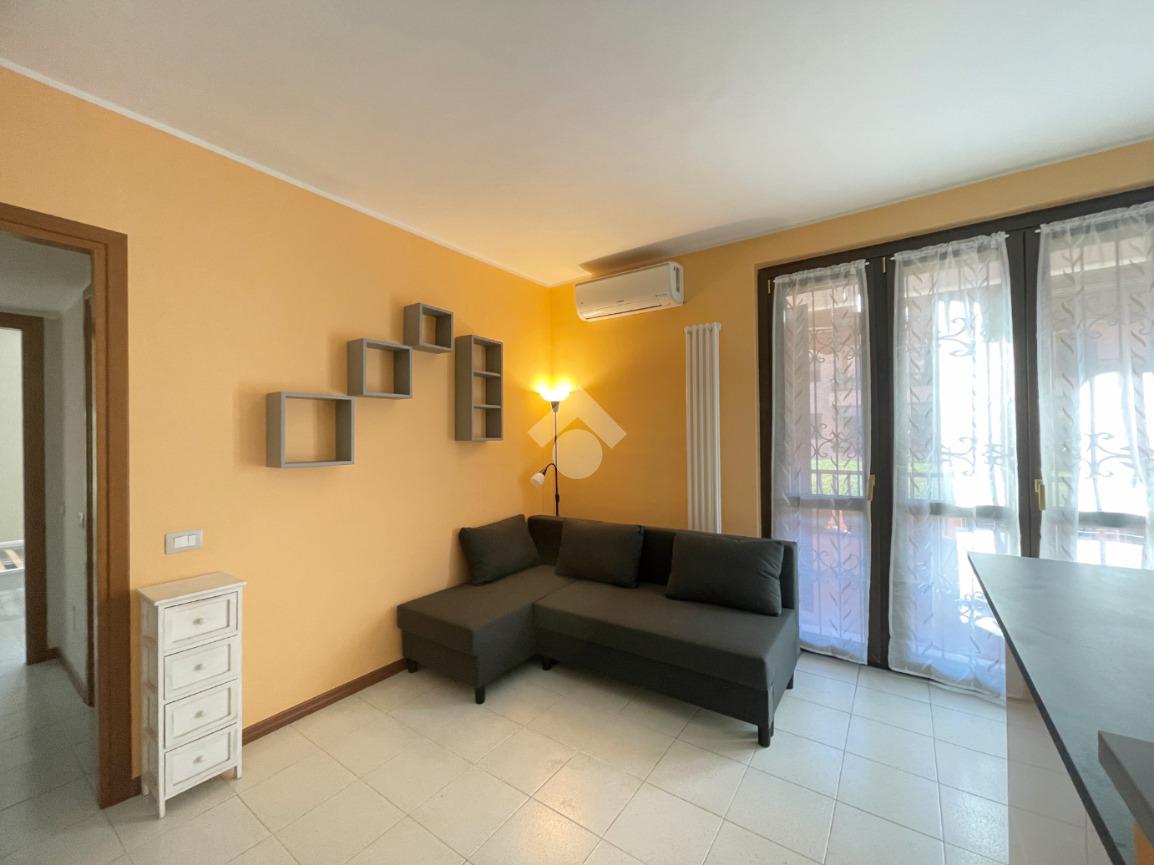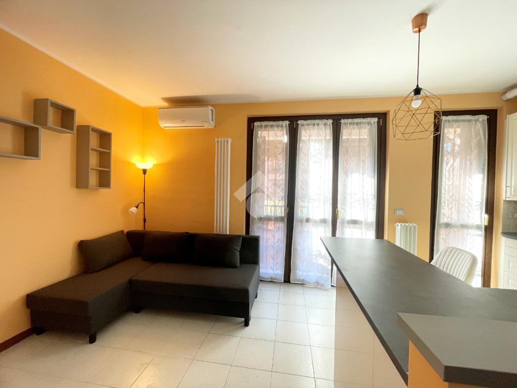 In stabile del 1991 con giardino condominiale, proponiamo in locazione un bilocale completamente ristrutturato e arredato. L'appartamento è composto da un soggiorno con cucina a vista, dotato di accesso a un balcone esposto a Sud, un bagno con box doccia e lavatrice e un'ampia camera matrimoniale. L'intera unità è pavimentata in ceramica e si completa con una cantina e un box singolo.